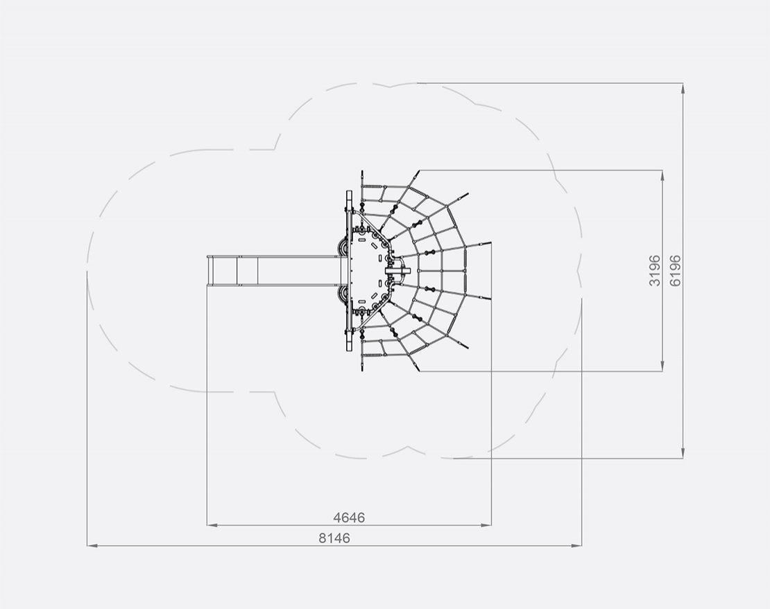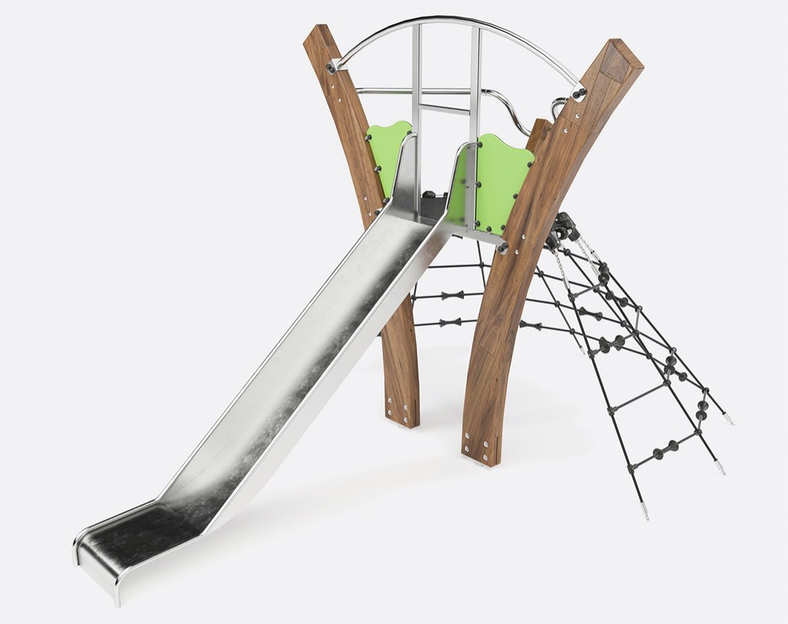 Состоит из опорных стоек, канатной сетки с пластиковыми уступами и металлической открытой горки с защитными бортиками. Все крепежные элементы закрыты составными колпачками.