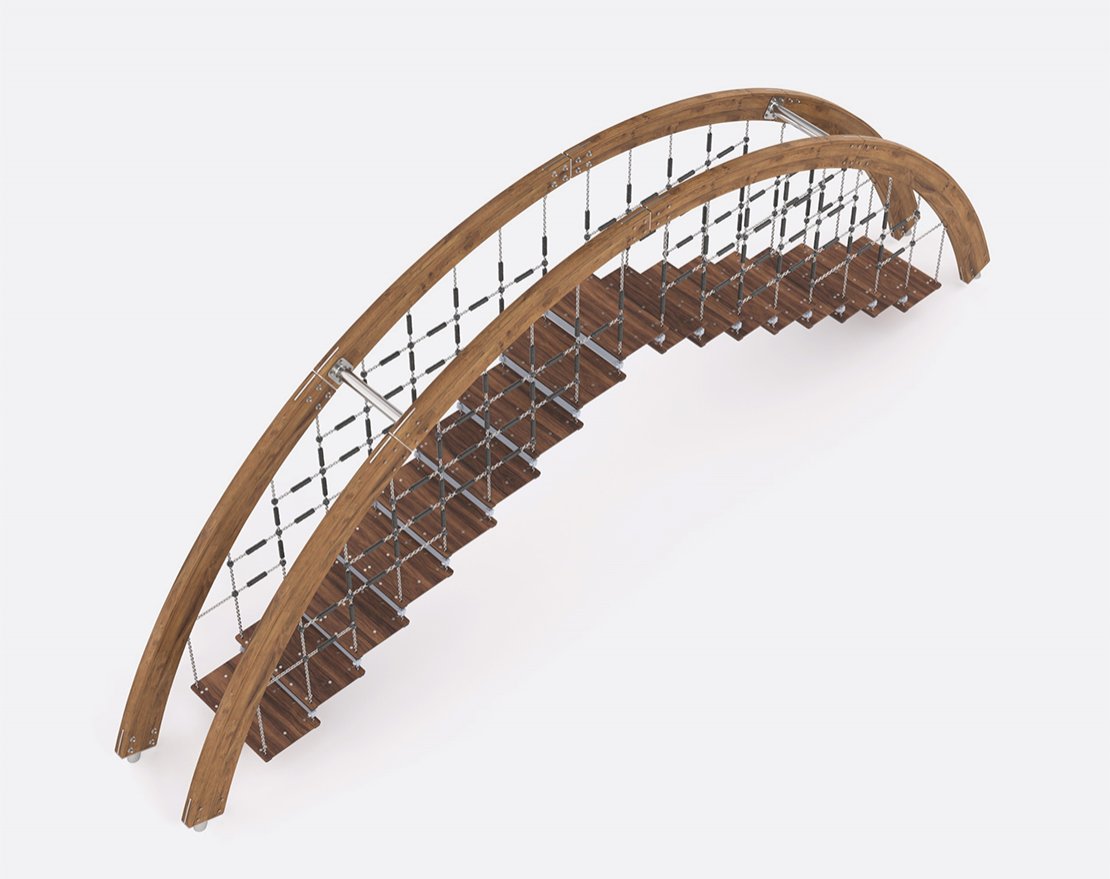 Конструкция представляет собой мостик. Состоит из металлического каркаса, цепей, оснащенных пластиковыми ручками и ступеней, выполненных из древесины. Все крепежные элементы закрыты составными колпачками.